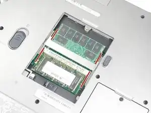 Нажмите на выделенный штифт наружу, пока оперативная память немного не выйдет из своего сокета.