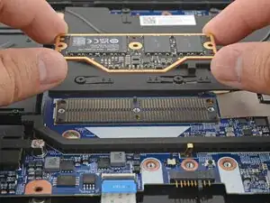Держите LPCAMM2 за края и положите его на разъем сжатия.