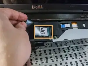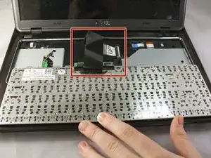 Аккуратно отключите ленту кабеля, подняв вкладку, удерживающую кабель на месте, с помощью пластикового инструмента. Уберите клавиатуру и ленту кабеля в сторону.