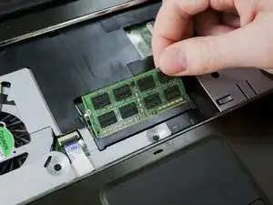 Найдите ОЗУ в верхней левой части панели доступа. Сжатием обеих сторон, нажмите на маленькие запирающие рычаги, расположенные по обе стороны от ОЗУ. Если все сделано правильно, ОЗУ выдвинется под углом, доступным для извлечения.