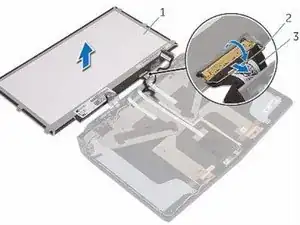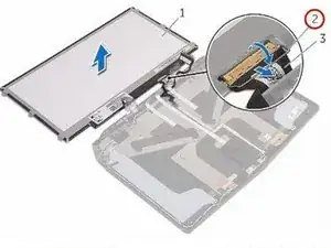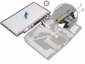 Поднимите фиксатор разъёма и отсоедините кабель дисплея от панели дисплея.