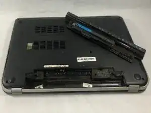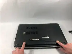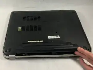 На нижней стороне внешнего корпуса ноутбука должны находиться два пластиковых сдвижных язычка справа и слева от аккумуляторного блока. С помощью пальцев отодвиньте эти два язычка друг от друга, к бокам устройства.