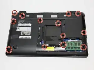 Используя отвертку J1 по японскому промышленному стандарту, открутите тринадцать винтов 9,5 мм с панели, закрывающей дно компьютера.