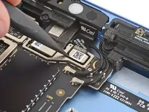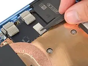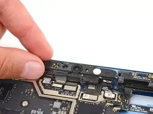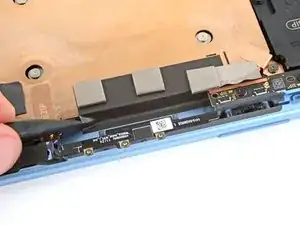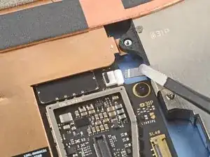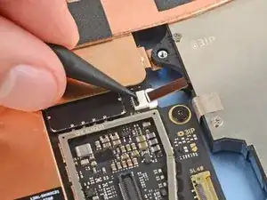 Используйте кончик лопатки, чтобы поддеть разъем нажатия правого микрофона (самый правый под фронтальной камерой) за его вырезанный край и отключить его.