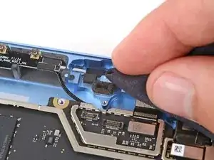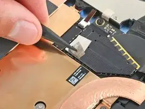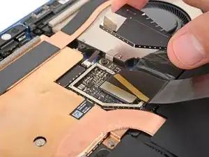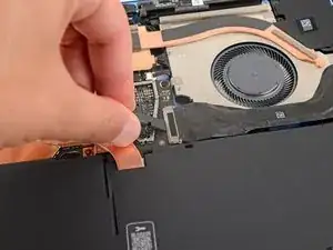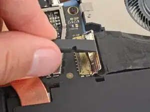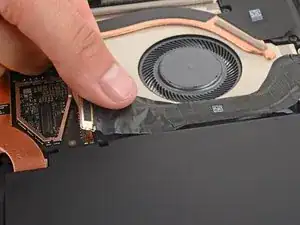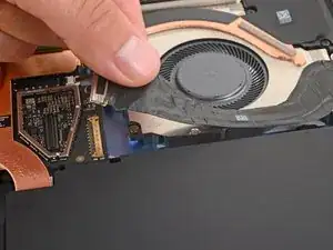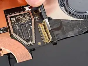 Используйте конец лопатки, чтобы поднять черную блокирующую защелку на кабеле вентилятора ZIF разъема, около центра левого края вентилятора.