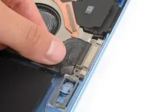 Мягкий клей фиксирует кабель разъема Surface Connect к нижнему краю вентилятора.