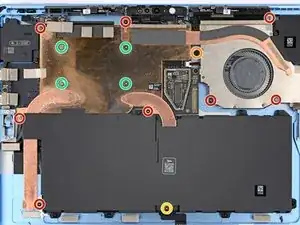Используйте отвертку Torx Plus 3IP, чтобы удалить 14 винтов, которые крепят тепловой модуль и сборку вентилятора: