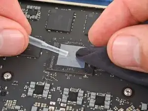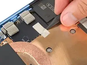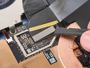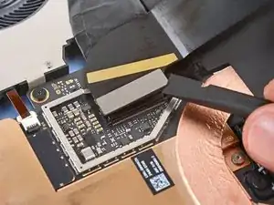 Используйте конец лопатки, чтобы поднять два кусочка серебряной проводящей ленты из верхнего левого угла теплового модуля.