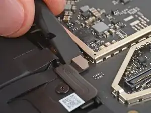 Используйте плоский конец лопатки, чтобы поддеть разъем для подключения батареи с короткой стороны и отключить его.