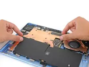 Используйте плоский конец лопатки, чтобы поддеть левые и правые края теплового модуля, рядом с тем местом, где изгибаются медные тепловые трубки.