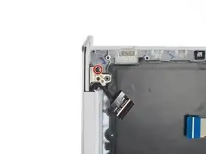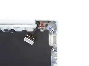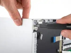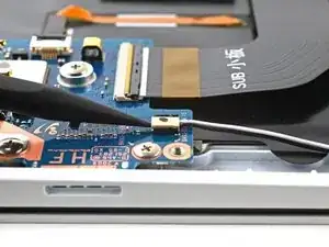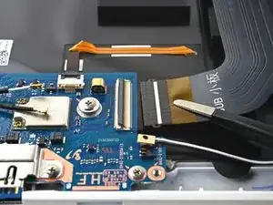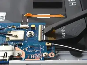 Используйте пластиковую лопатку, чтобы аккуратно приподнять фиксатор на ZIF-разъёме для кабеля подсветки клавиатуры.
