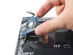 Отсоедините кабель подсветки клавиатуры, сдвинув его из гнезда на дочерней плате.