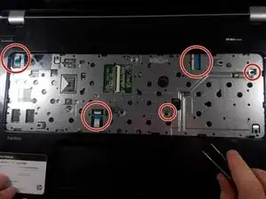 Пинцетом отсоедините все ленточные кабели, которые видны после снятия клавиатуры.