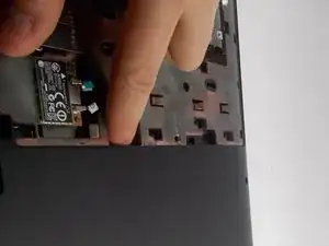 Пинцетом или другим тонким предметом нажмите внутрь и слегка влево (отдаляя от отсека дисковода). На лицевой стороне компьютера (со стороны клавиатуры) вы увидите, как часть клавиатуры приподнимается. С помощью лопатки подденьте клавиатуру и проведите лопаткой по всем четырём углам.