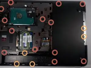 Удалите все винты 5 мм с задней панели компьютера. Они отмечены оранжевым на первой фотографии.