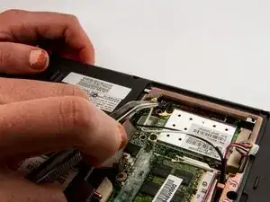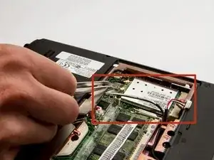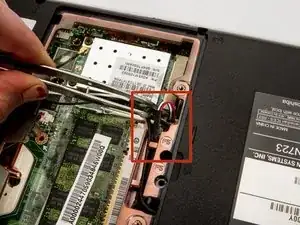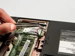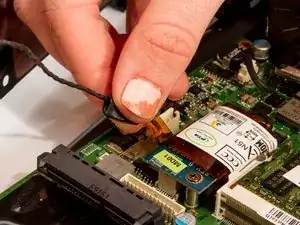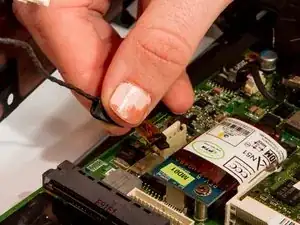 Захватите шлейф питания пинцетом и отсоедините его от антенны беспроводной сети.