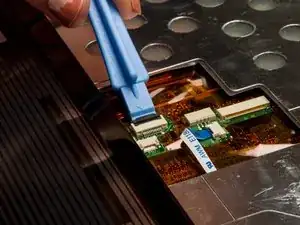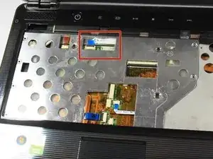 В отверстии над тачпадом используйте пластиковую открывалку, чтобы поднять чёрную защёлку разъёма ZIF.
