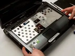 После снятия клавиш аккуратно извлеките клавиатуру. Будьте осторожны с ленточным кабелем, который всё ещё соединяет клавиатуру с материнской платой.