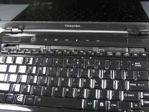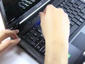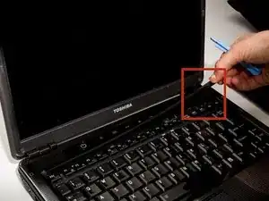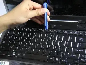 Используйте пластиковую открывалку, чтобы приподнять чёрную пластиковую вставку. Она расположена в верхней части клавиатуры.