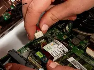 Отсоедините вспомогательный кабель питания, подключённый к синей плате на задней части ноутбука.
