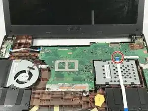 Удалите разъемный кабель, прикреплённый к нижней части материнской платы.