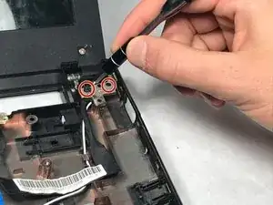 Используйте черную пластиковую лопатку, чтобы снять черные квадраты на нижней части экрана ноутбука, это раскроет два винта.