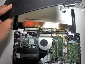 Возьмитесь за край петли, как показано, и отделите петлю от дисплея.