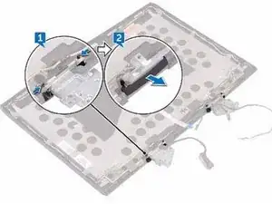 Поднимите петли с задней крышки дисплея и сборки антенн.