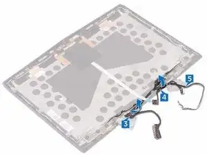Проложите кабель дисплея через направляющие на задней крышке дисплея и сборке антенн.