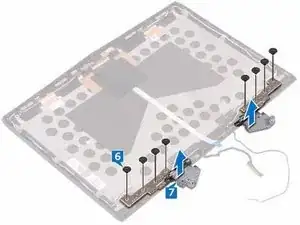 Удалите восемь винтов (M2.5x2.0L), которые крепят петли к задней крышке дисплея и сборке антенн.