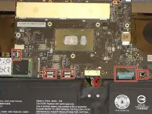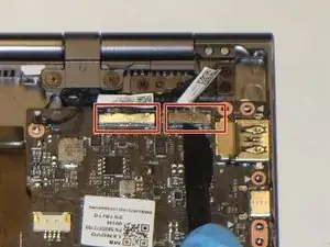 С помощью пластмассового инструмента для открытия аккуратно приподнимите металлические язычки двух кабелей дисплея, чтобы извлечь кабели из верхнего правого угла материнской платы.
