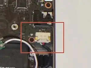 Используя два пластмассовых инструмента для открытия, аккуратно отключите белый разъём динамика в нижнем левом углу материнской платы.