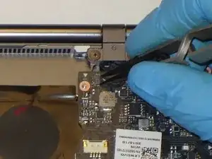 С помощью обратных пинцетов аккуратно выньте маленький чёрный кабель в верхнем правом углу материнской платы.