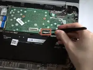 Отклейте ленту с кабеля, соединяющего аккумулятор с материнской платой.