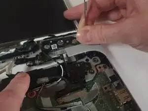 Удалите два винта 1 мм, удерживающие металлическую рамку, с помощью отвертки Phillips #00.
