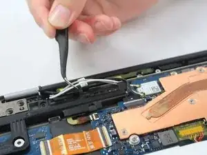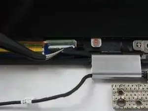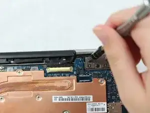 Отсоедините провод, захватив чёрную часть точными пинцетами и потянув в сторону от Chromebook Pro.