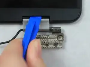 Поместите пластиковый лопаточный инструмент под углом в зазор между петлёй и экраном Chromebook и поднимите вверх.