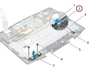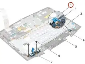 Снимите винты, фиксирующие плату кнопки питания к сборке подставки под ладонь.