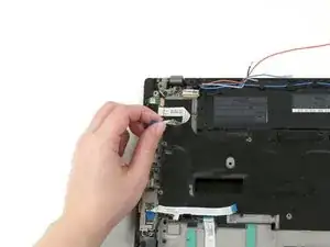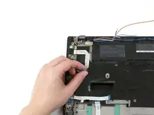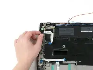Используйте пинцет с притуплёнными концами, чтобы вытащить кабели трекпада и сканера отпечатка пальца из их разъёмов на плате.