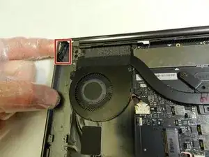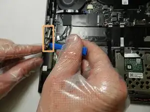 Возможно, придётся провести пластиковым инструментом вдоль кромок, пока не появится небольшой зазор для отделения задней крышки от ноутбука.