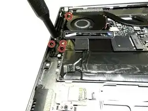 Удалите винт (2 мм с головкой 5 мм), который крепит SSD к материнской плате, используя крестовую отвёртку Phillips #00.