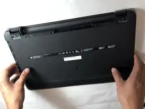 Положите ноутбук вверх ногами на ровную поверхность.