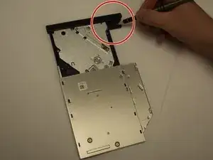 Чтобы снять лишние детали с оптического привода, надавите на пластиковую защёлку за лицевой панелью лотка.