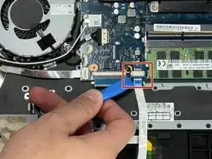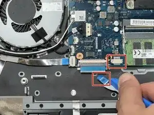 С помощью лопатки или инструмента для вскрытия iFixit снимите защёлку, удерживающую ленточный кабель на материнской плате.