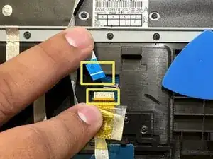С помощью лопатки подденьте чёрную пластиковую защёлку, фиксирующую ленточный кабель, и извлеките ленточный кабель.