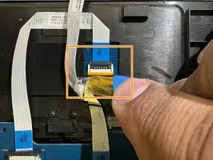 С помощью лопатки или инструмента для вскрытия iFixit аккуратно отлепите два слоя защитной ленты, закрывающей второй крепёжный разъём кабеля.