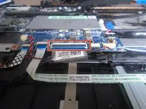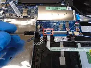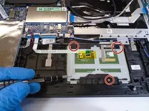 Отключите шлейф тачпада от платы с помощью нейлоновой лопатки.