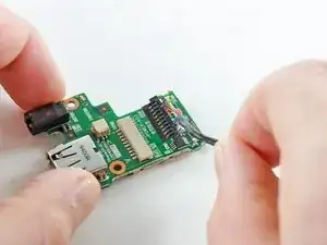 Используйте пинцет, чтобы вытащить кабель внутреннего переключателя дисплея прямо из его разъема на плате USB и питания.