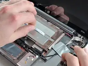 Верхняя крышка всё ещё соединена через ленточный кабель сенсорной панели, подключённый к материнской плате. Пока не снимайте её полностью.