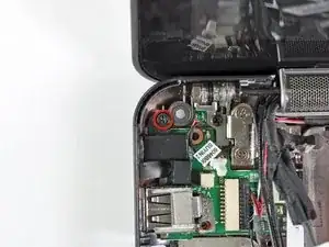 Удалите один винт Phillips 3 мм, который закрепляет плату USB и питания, а также кронштейн разъема постоянного тока к нижнему корпусу.